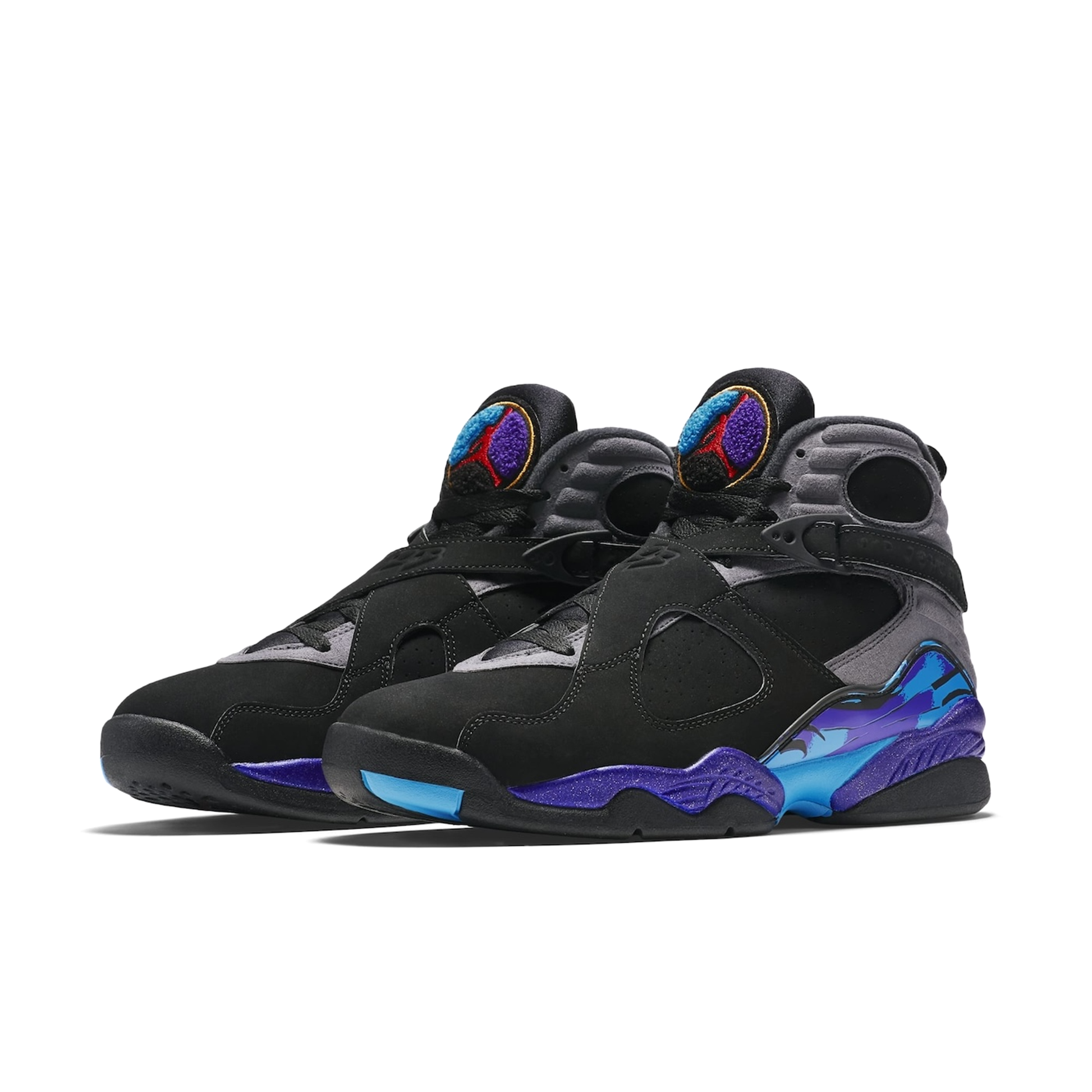 First worn by MJ on the '92-'93 season's star-studded stage, the iconic "Aqua" colorway returns. Just like the original, the richly crafted design swirls Aquatone and Bright Concord accents against the black and Iron Grey upper. Nubuck leather is complemented by airy textiles and synthetic leather, while the tri-tone Jumpman patch on the tongue take this textural masterpiece right back into orbit. It combines crisscross midfoot straps and a stretchy inner sleeve enhance stability, while Nike Air technology in the heel and forefoot add lightweight cushioning. This coveted colorway is among the AJ8's three original colors released in 1993—history's in the making again.