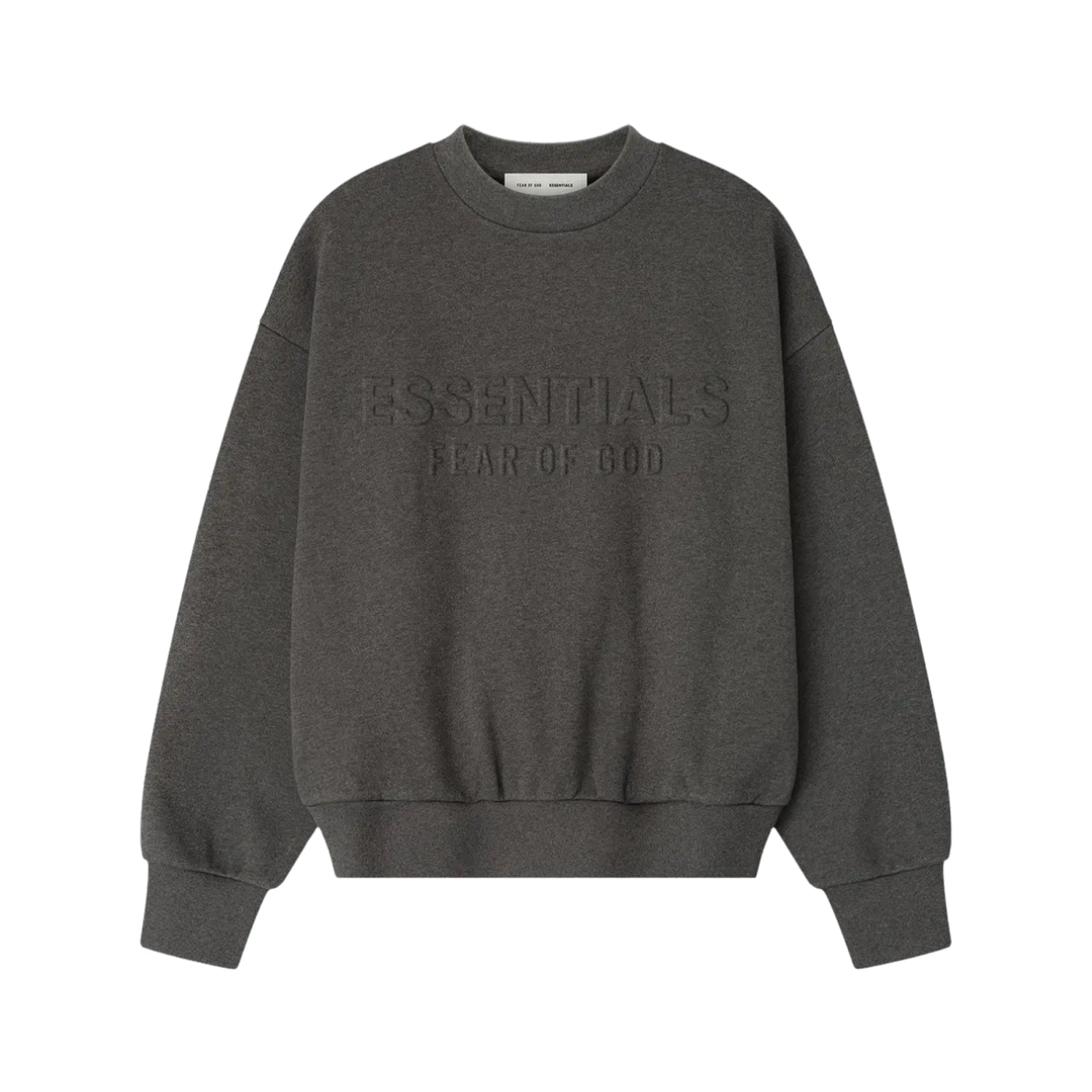 FEAR OF GOD ESSENTIALS EMBOSSED CLASSIC CREWNECK SWEATSHIRT CHARCOAL HEATHER