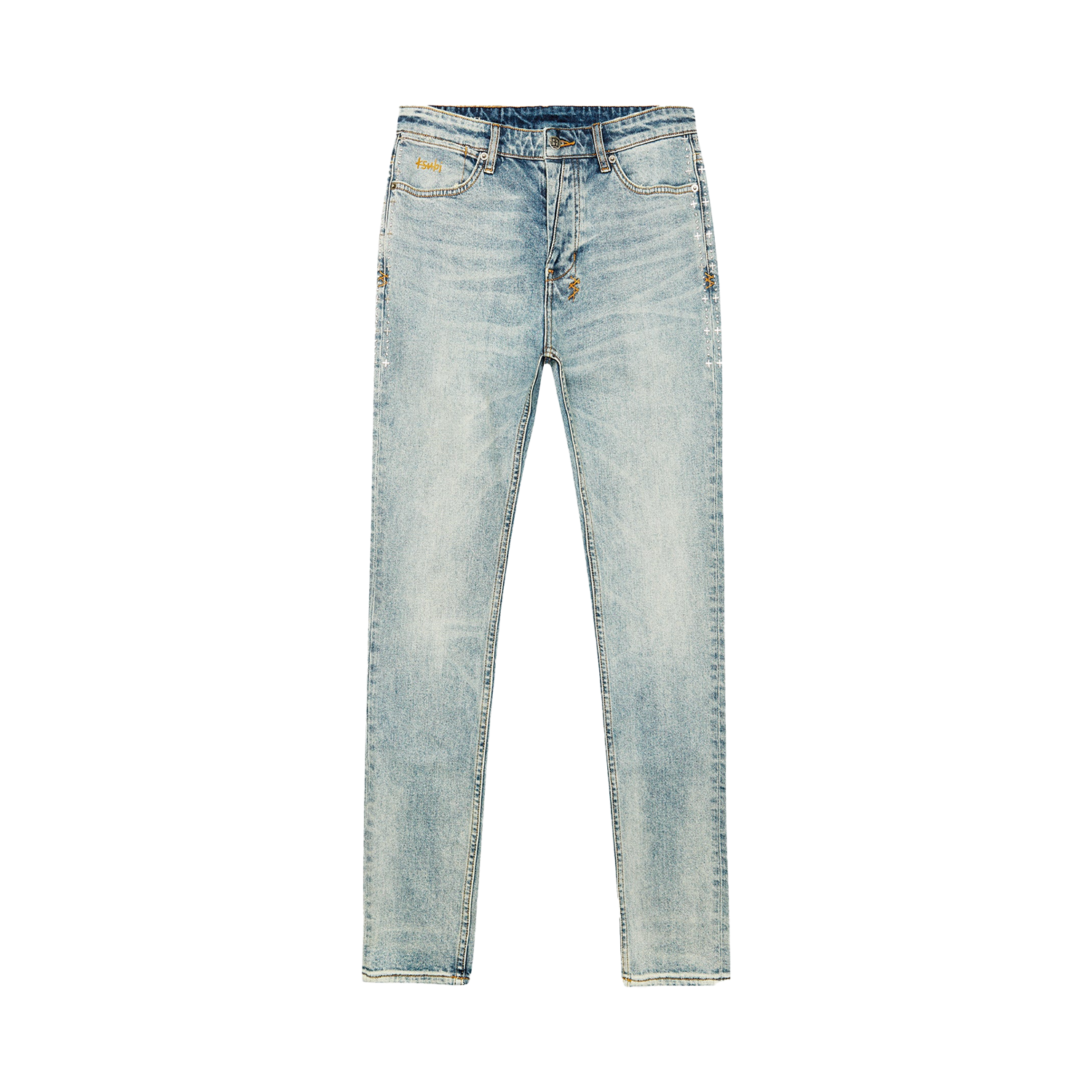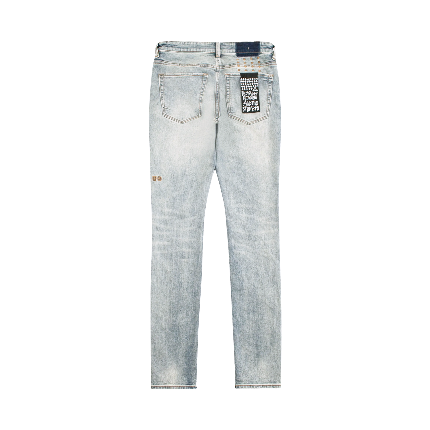 The Van Winkle Sky High Metalik is a full length skinny leg jean made from a light indigo comfort stretch denim. This stonewashed jean features hot fixed metal patterns running down the side seams and is finished with classic Ksubi branding including the t-box and 4x4 embroidery. Constructed with an unique angled belt loop, a front fly seam detail and detailed with aging treatments.