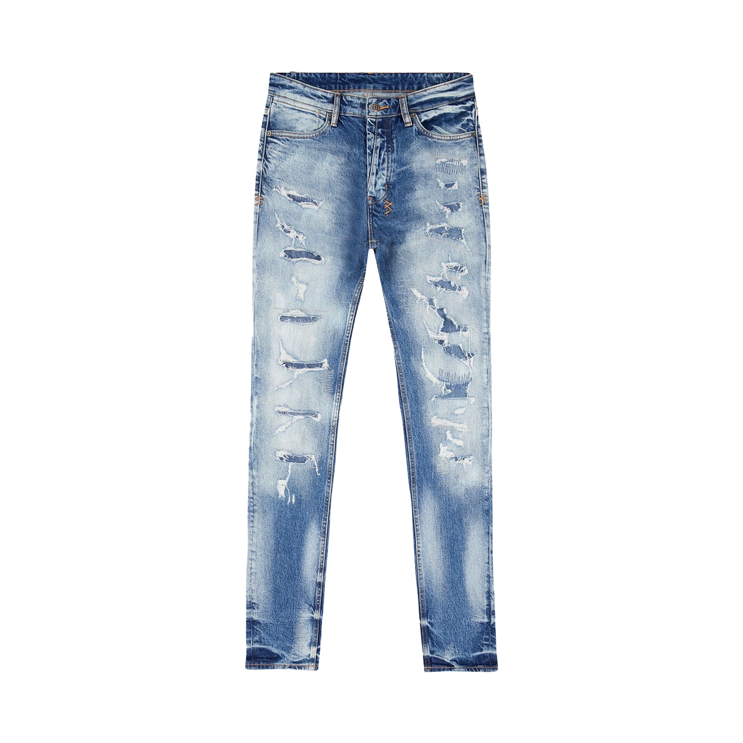The Van Winkle Tektonik Dialled is a full length, skinny fit jean designed with heavy fading, rip and repair details on the front and back legs and our signature Ksubi branding. This mid rise jean is constructed from premium comfort stretch denim in a medium wash and is designed with a classic five pocket styling, light grinding, unique angled belt loops, a button fly, fly stitch detail and zigzag bartack side seams and fly.