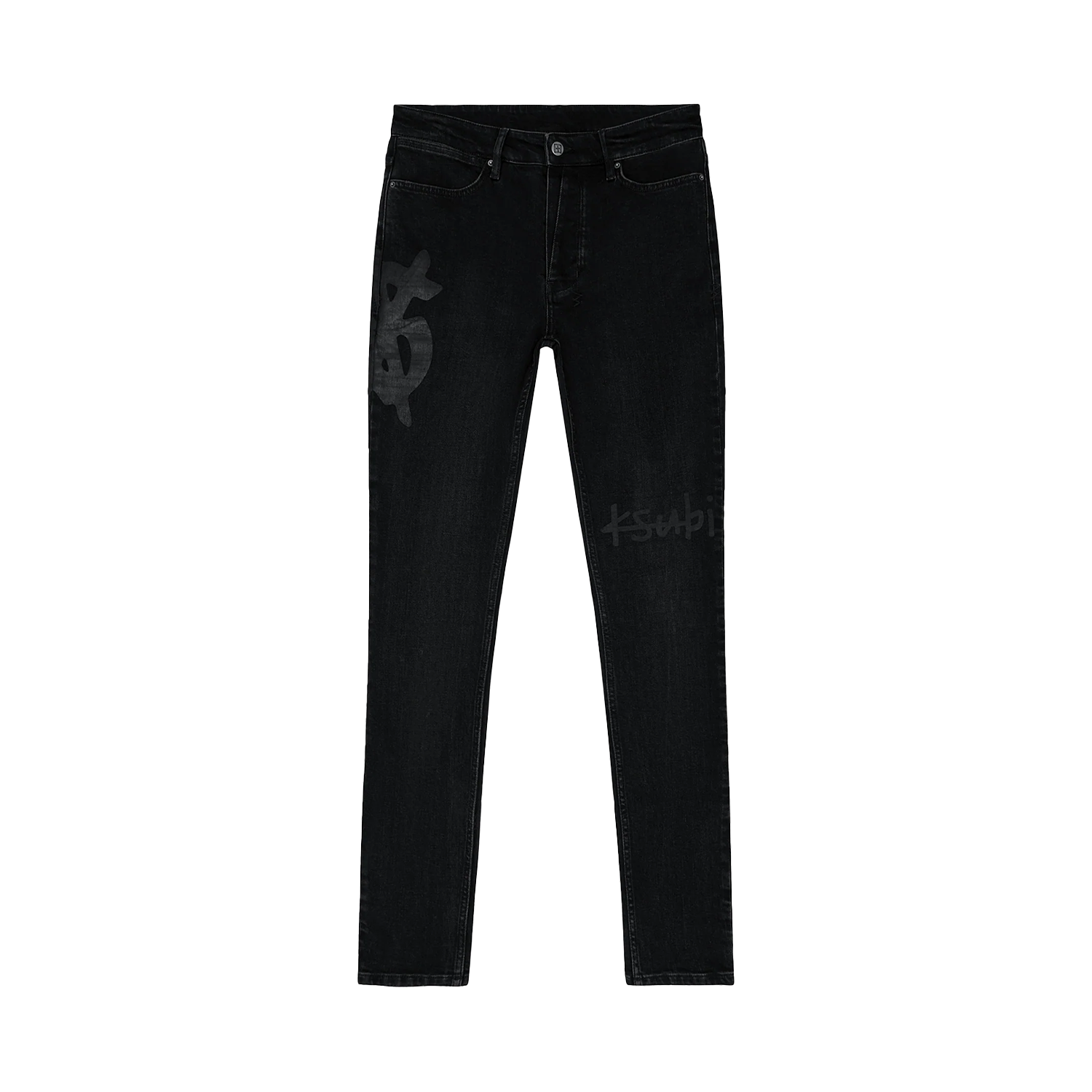 The Van Winkle Lock Up Black is a full-length, skinny jean with a mid-rise and five-pocket design. Constructed from premium black comfort stretch denim, this style has unique angled belt loops, a front fly seam detail, contrast wear deconstruction detail and screen-printed artwork on the left leg. Finishes include t-box and 4x4 embroidery, ghost patching detailing and Ksubi branded hardware.